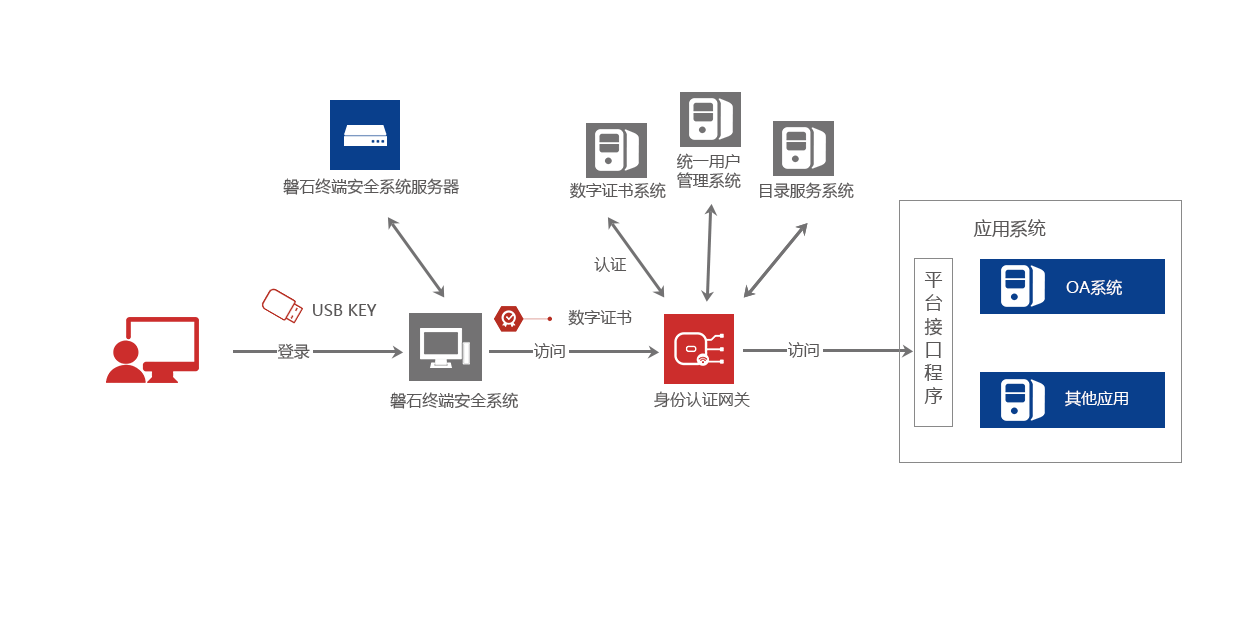 方案以PKI/CA体系为基础,为用户提供标准的用户身份即数字证书,基于数字证书在终端登录及应用访问时对用户进行身份认证,并对用户进行授权、审计等安全管理,从而实现信息系统的安全加固。