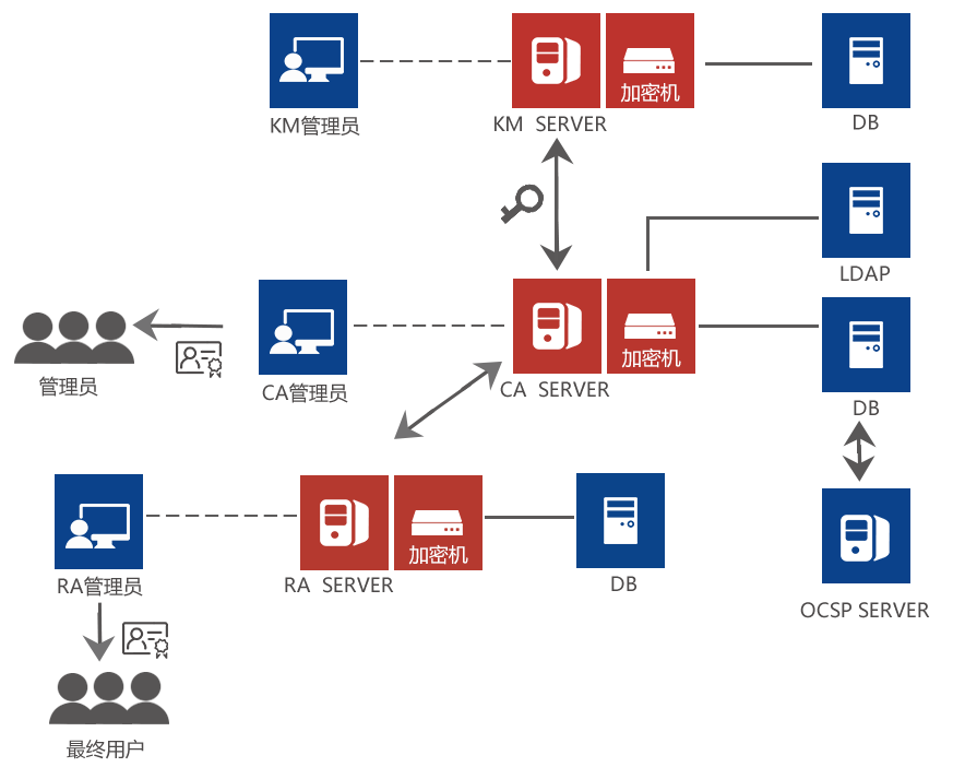 CA Server:负责数字证书的签发、注销以及证书注销列表的签发等管理功能