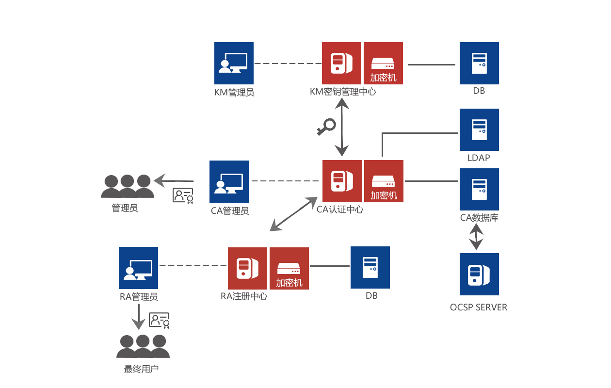PKI系统由认证中心(CA)、注册中心(RA)、密钥管理中心(KMC)、证书发布系统几个组件组成。其中CA作为PKI的核心部分,负责所有数字证书的签发、注销以及证书注销列表的签发等管理功能。RA注册中心是CA发放、管理数字证书等业务的延伸,它负责所有数字证书的申请者的信息录入、审核等工作,同时对发放的数字证书进行管理。密钥管理中心(KMC)为CA提供用户加密密钥的生成及管理服务。证书发布系统提供颁发证书和证书撤销列表(CRL)的发布及查询服务,其形式包括LDAP目录发布、Web发布及OCSP线证书状态查询服务等。